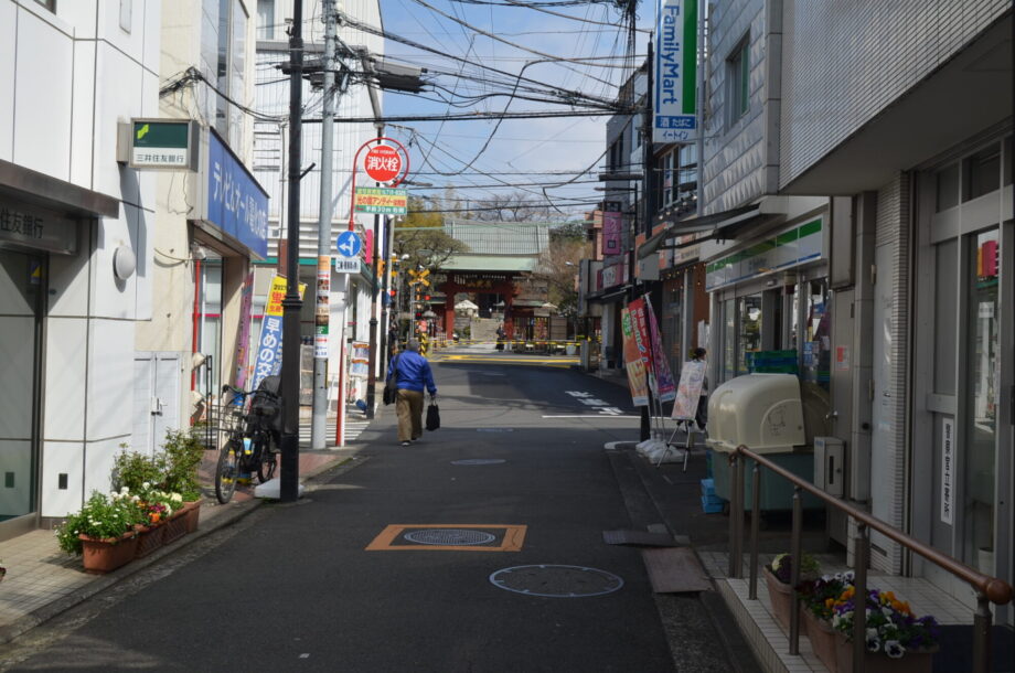 商店街の先に見える妙蓮寺の容姿