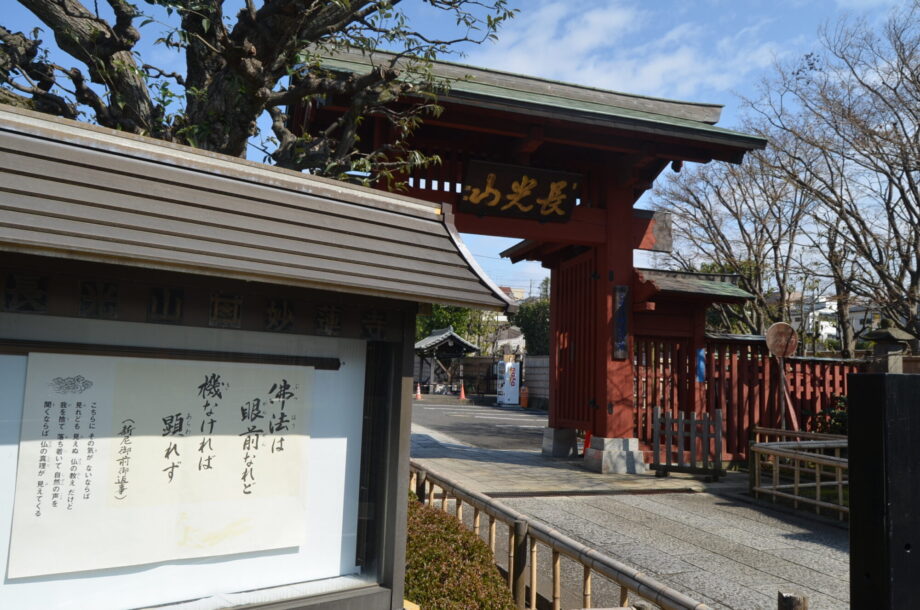 この山門は、日蓮宗大本山・池上本門寺の山門を模して造られたとか。明るい日差しを受けた山門は、末永く光り輝く寺でありたいとの願いが込められている山号「長光山」のイメージ通りといった印象です。