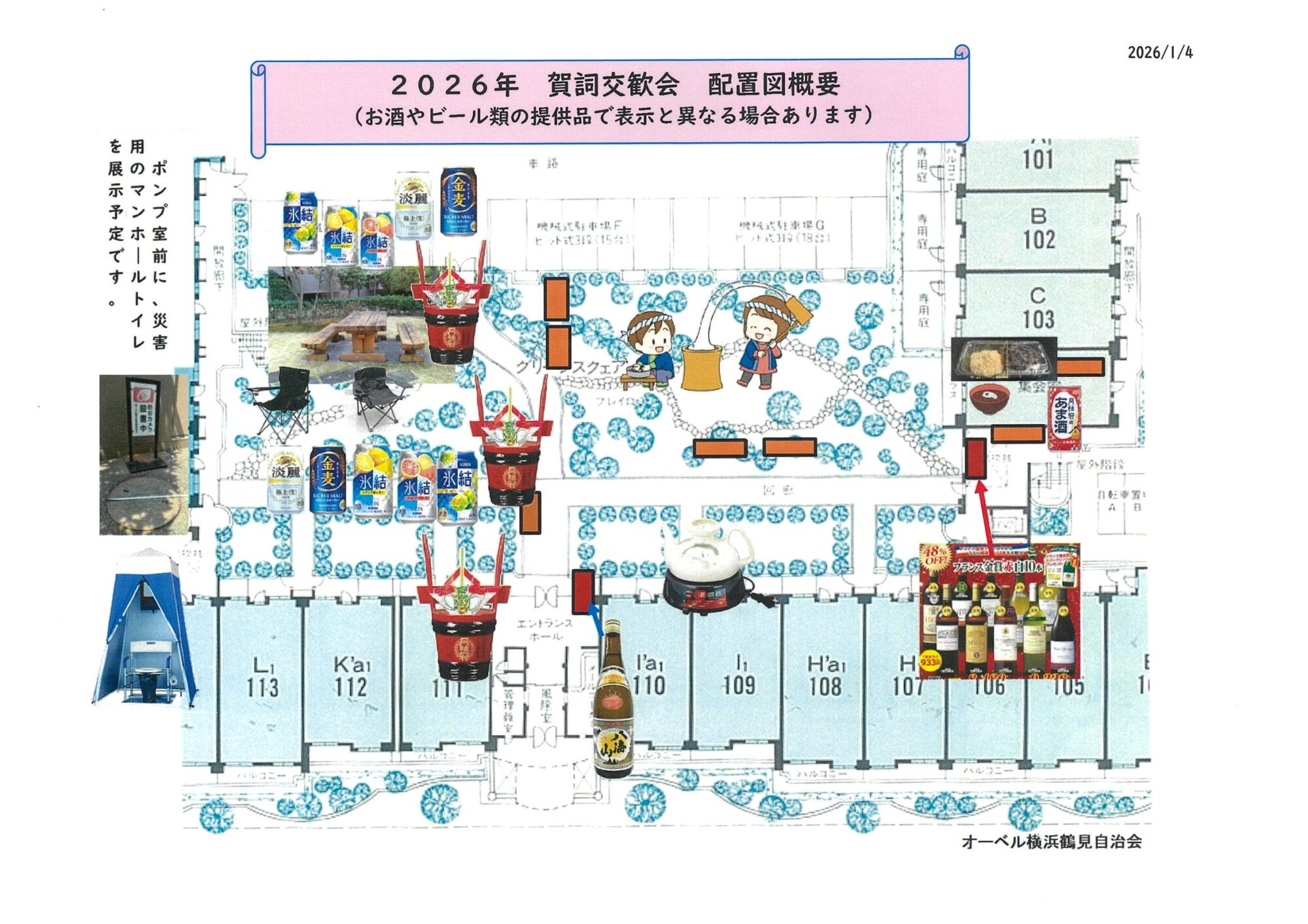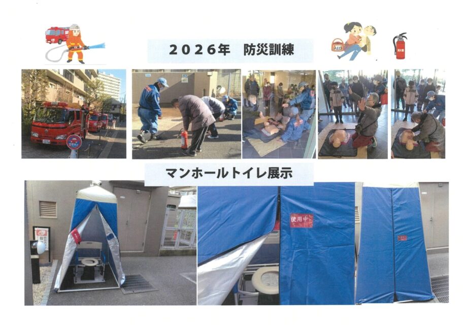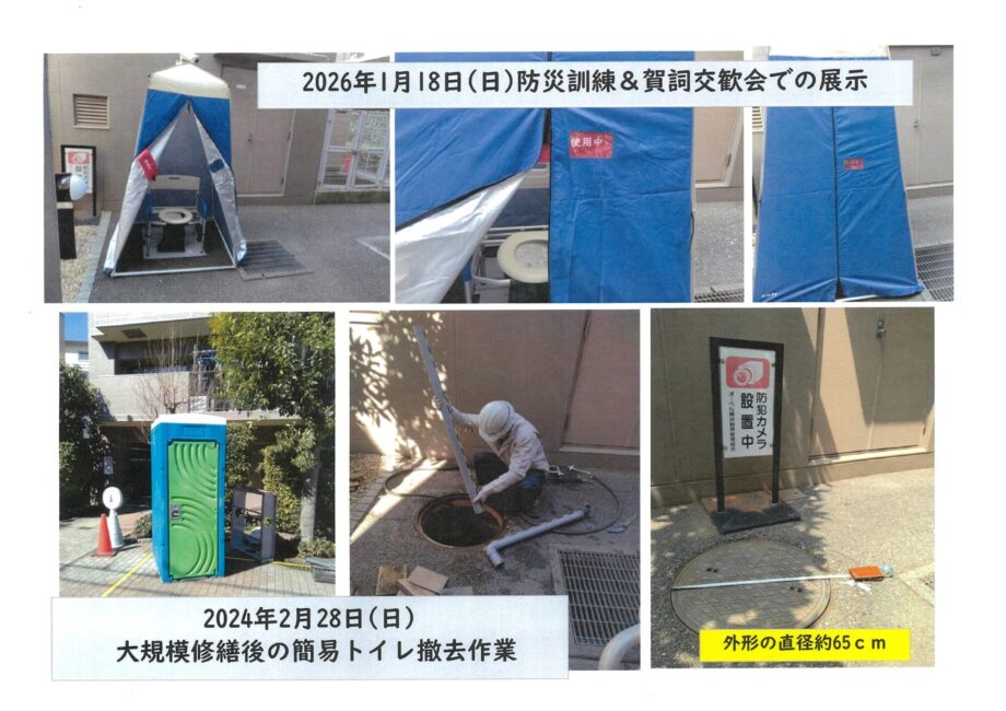 2023年8月頃から始まった大規模修繕の際に、ポンプ室の扉横に臨時の簡易トイレが設置され、作業者が半年間利用しておりました。防災拠点である市場小学校の校庭に設置訓練された場所は、下水用マンホールの上でした。災害時のマンホールトイレとして当マンションでの設置場所を模索しておりましたが、ポンプ室の扉横が可能性と分かりました。 なお、2019年10月16日の避難訓練では、マンホールトイレの組み立てを行われました。