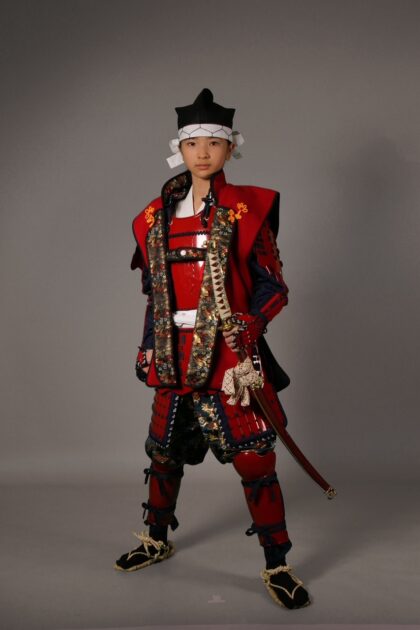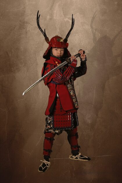 赤色の甲冑と鹿の角をあしらった兜が特徴。鹿の角は「覚悟」の証ともされ、戦いに挑む武将の決意を感じられます。