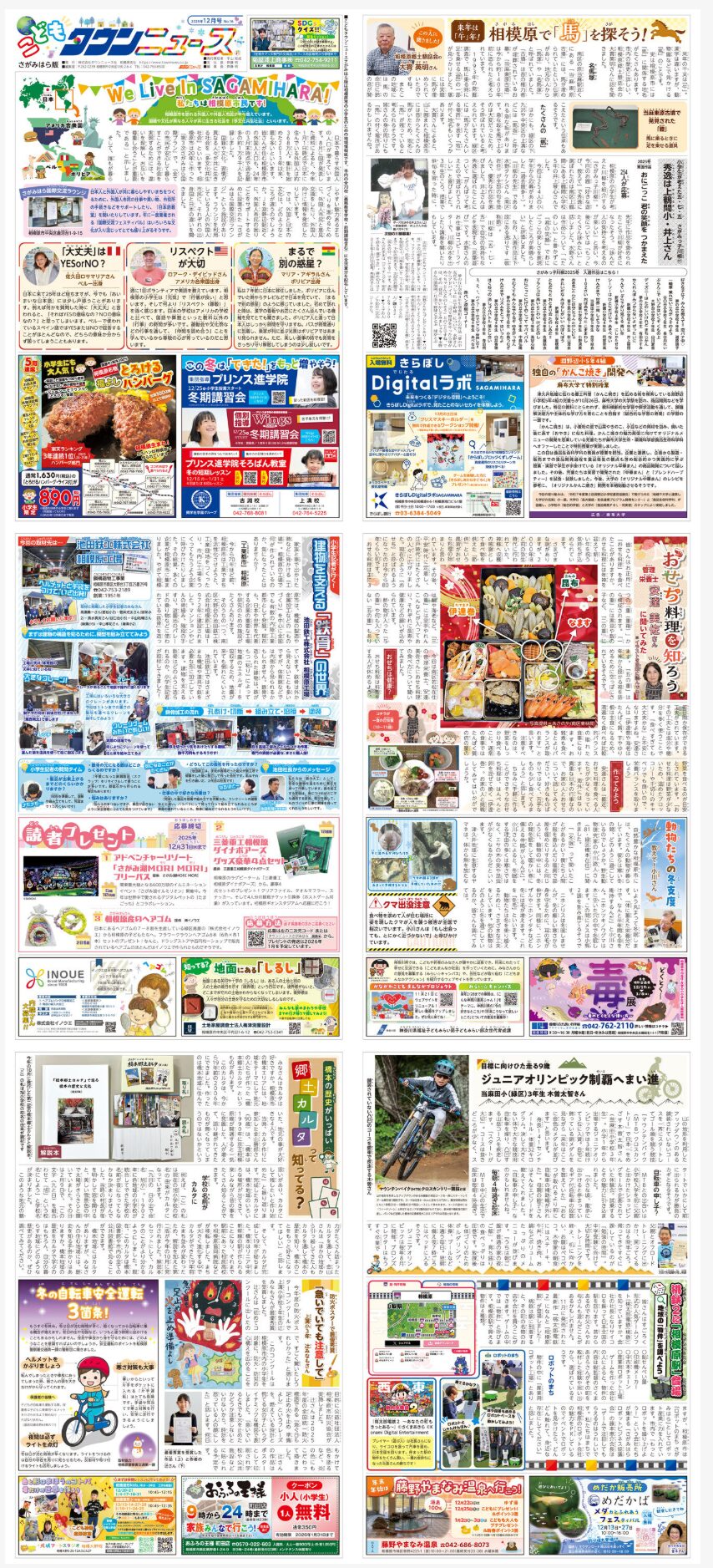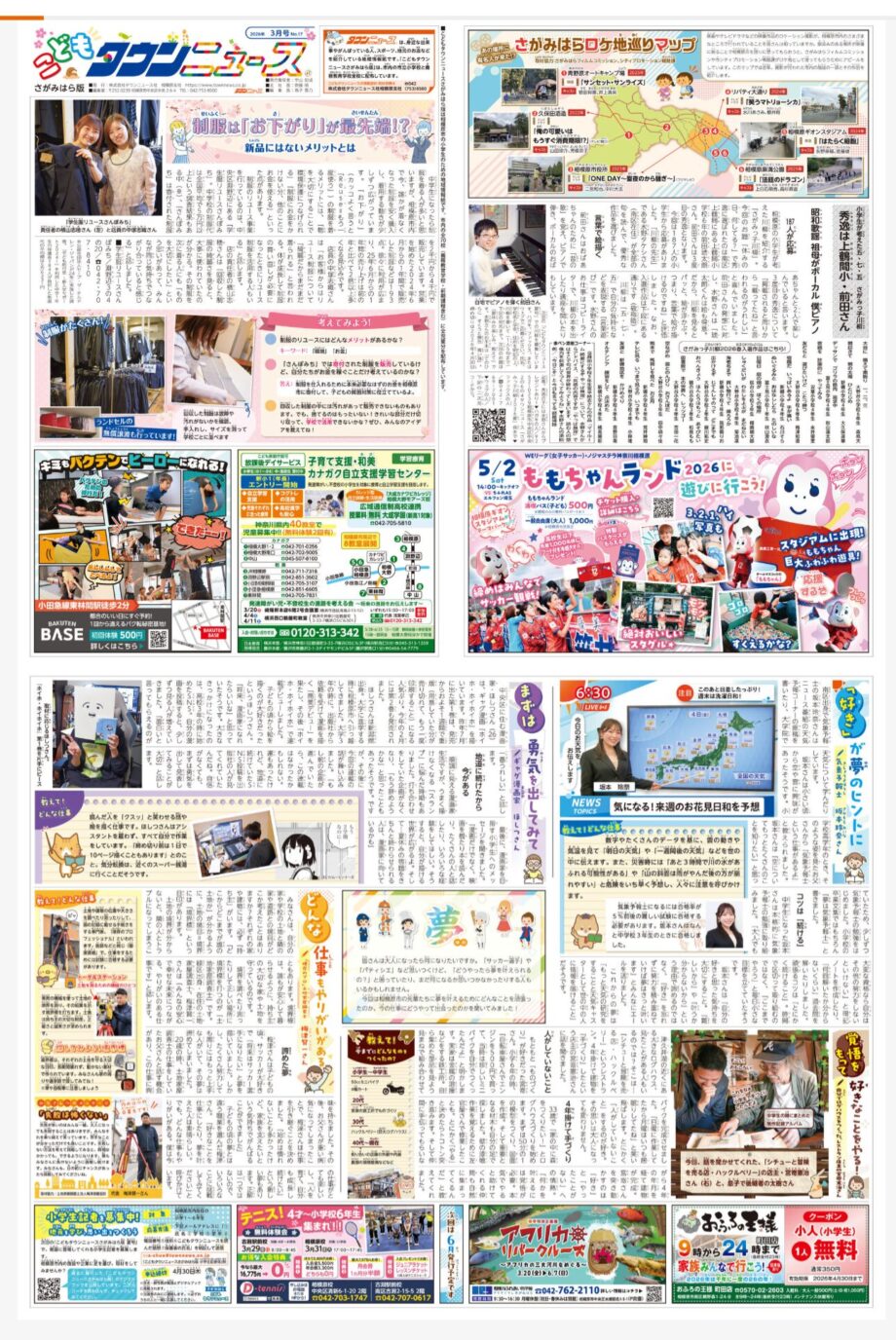 「こどもタウンニュースさがみはら版」は、小学生のための地域情報紙です。相模原について学ぶことができる楽しい紙面を目指して、毎年夏と冬に発行しています。地元のおもしろい取り組み、相模原のおすすめスポットの紹介や活躍するスターへのインタビュー、子ども記者によるレポートなど、さまざまな企画を掲載しています!