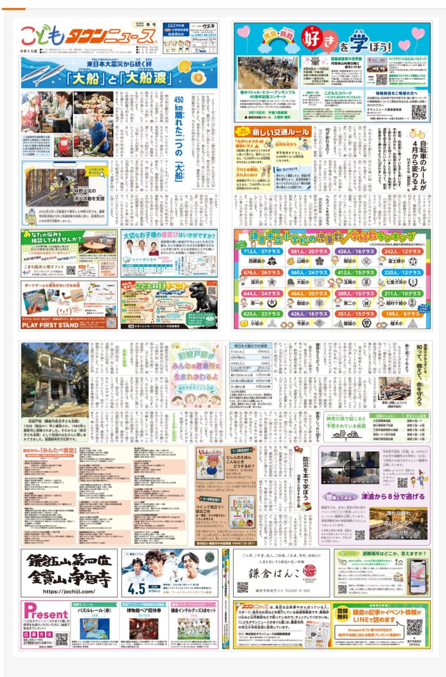 「こどもタウンニュースかまくら版」は、鎌倉の小学生のための子ども新聞です。「子どもが読みたくなる」「読んで楽しい」「地元が好きになる」紙面を目指して、年2回(9月末と3月頭)に発行しています。