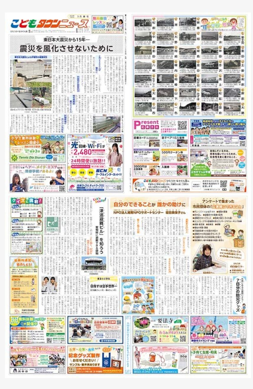 「こどもタウンニュースひらつか・なかぐん版」は、平塚・中郡の小学生のための子ども新聞です。紙面を通じて、自分たちの住む地域を深く知り、もっと好きになるきっかけづくりになればと思い、年3回(7月、11月、3月)発行しています。活躍する小学生を紹介する「夢追う小学生」や、クイズを通して学ぶ「Let’s Study」、大人気・全校紹介コーナーなど、平塚・中郡地域の魅力がギュッと詰まった紙面になっています。