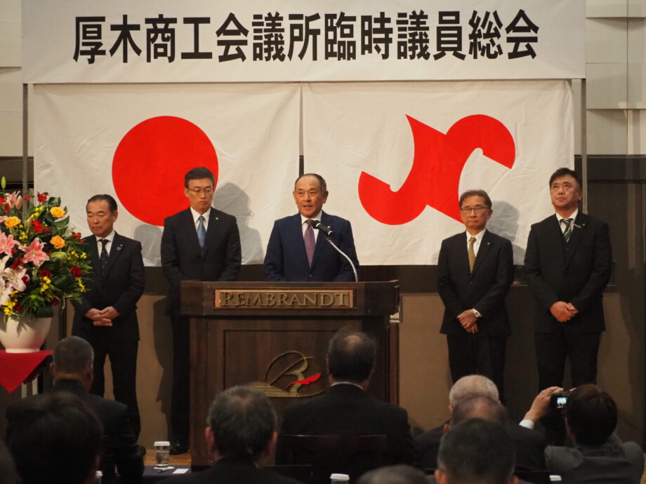 厚木商工会議所では、任期満了による役員改選に伴う臨時総会を11月4日にレンブラントホテル厚木で開催。新たに小杉伸夫氏(㈱コジマホールディングス代表取締役社長)が会頭に就任しました。小杉会頭は「中村会頭が築き上げてくださった財務体質の改善や強化された組織力などを引き継げることは幸せであり、感謝しかない。今年度の事業計画は新体制で進めていくことになるが、計画通り成果が上がるように努めていくことが、中村会頭への感謝の気持ちになると思い、頑張っていく」と話しました。