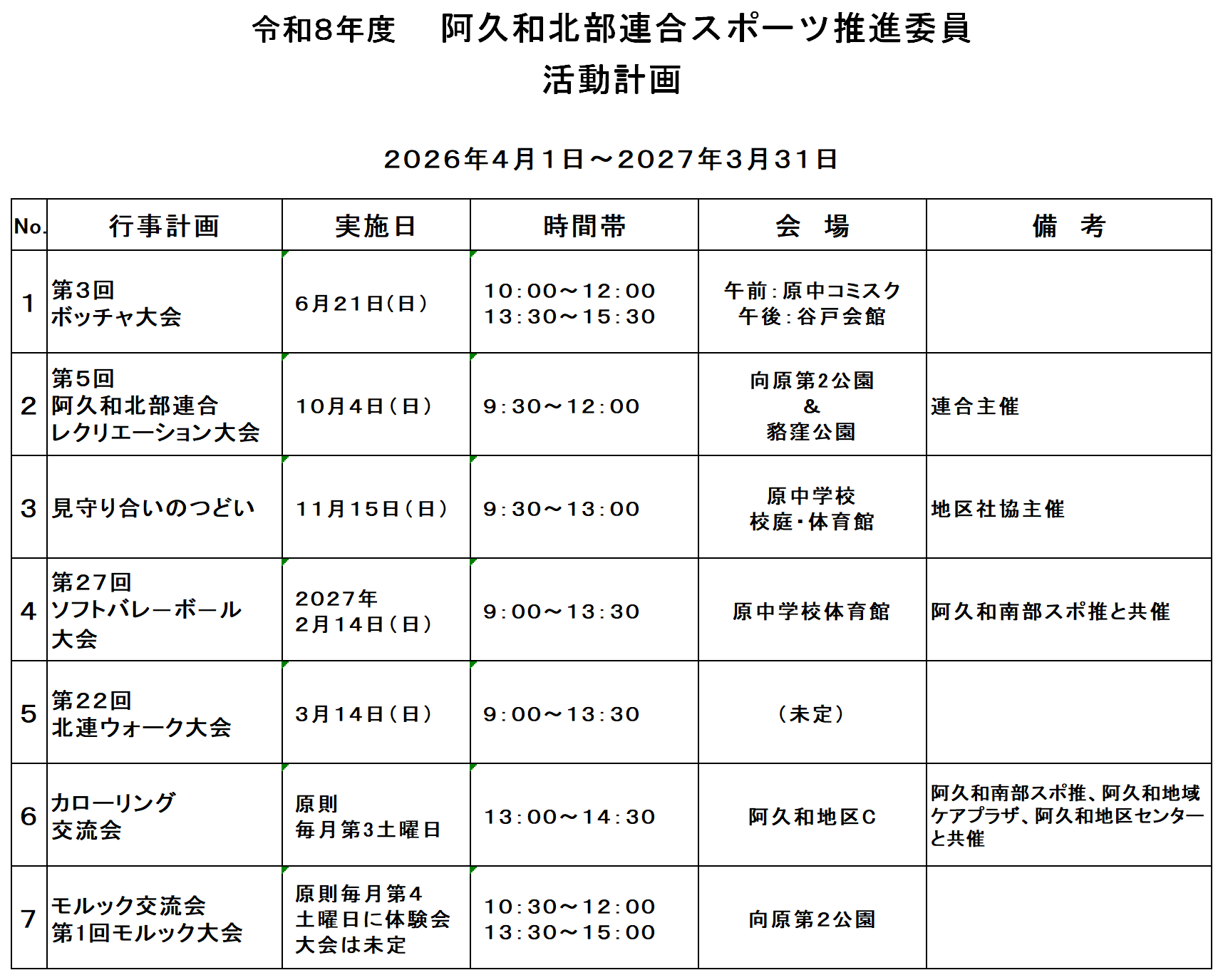 女子バレーボール大会 :9人制、6月頃開催、5~6チーム参加、男性は後衛のみ