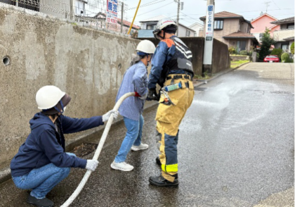 を実施しました。放水訓練は、実際の自治会の防災備品を利用して行いました。