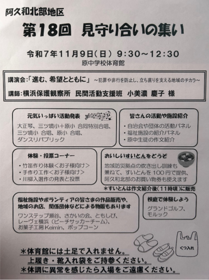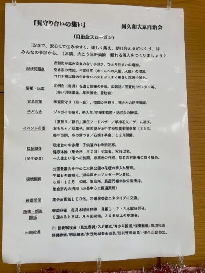 阿久和北部内のすべての人々が、心穏やかに、安全で安心して暮らせるそんな地域でありたい・・・これは誰もが願うところです。