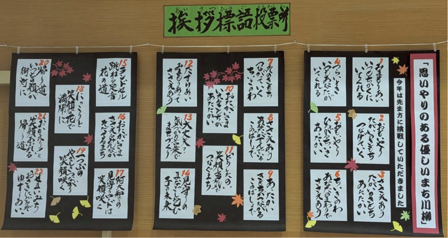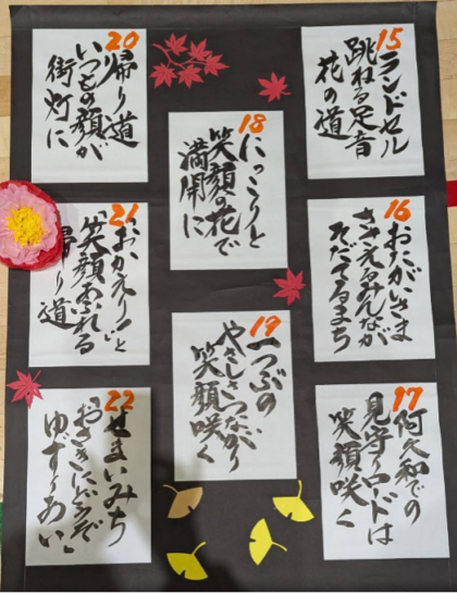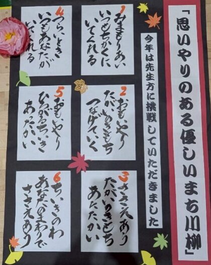 原中、原小、三ツ境小の先生方から募集した、「思いやりのあるやさしいまち」をテーマにした川柳の中から、当日来場者の皆さんに投票いただき、優秀作品9編と、最優秀作品3編(花弁が付いてます!)を決定しました。