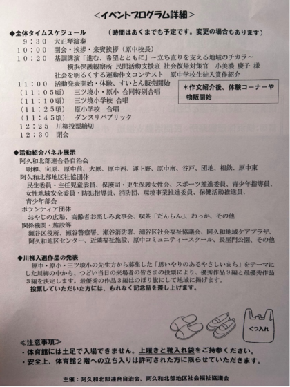 原中学校吹奏楽部の演奏で幕を開ける『第17回見守り合いのつどい』。阿久和北部のあらゆる団体のパネル展示では、活動内容がわかりやすく発表されます。中学生や小学生、地域の皆さんから応募された「見守り合い川柳」は皆さんの投票により決定した最優秀作品が旗に染め抜かれ、阿久和北部の街角にはためきます。