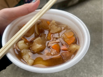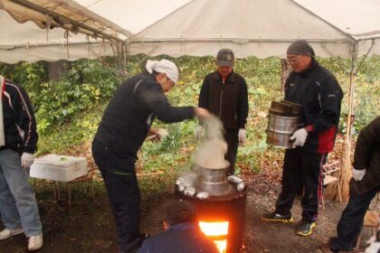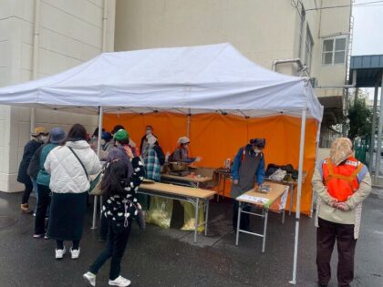 地域防災拠点の炊き出し訓練も兼ねて「すいとん」を販売し、270食をご提供しました。当日は朝まで雨が降り続き肌寒い気候でしたが、温かいすいとんをみなさんも笑顔で召し上がっていました。