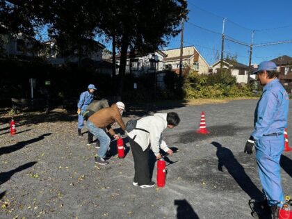 - 水消火器を使った初期消火訓練で消火器の使い方を体験