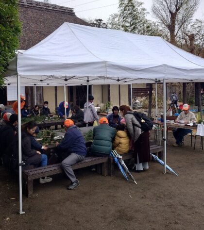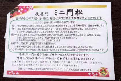 新年を迎えるにあたり、ミニ門松作りが催されました。ミニ門松は、松・竹・梅・稲穂・クロガネモチが材料です。太い竹を土台にし、中に細い3本組の竹をセットして周りに松葉を詰めていきます。次に梅とクロガネモチの枝を差し込み、稲穂を飾ったら高さ20センチほどの可愛い門松の完成です。
