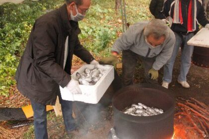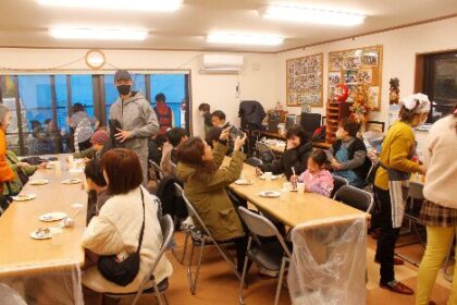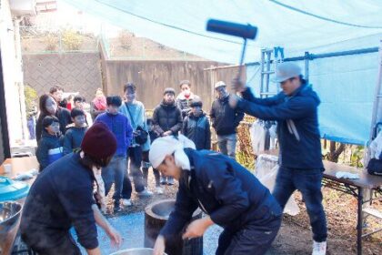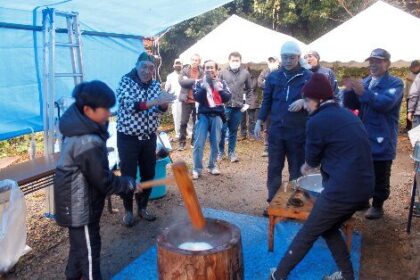 毎年12月恒例の餅つき会が行なわれました。自治会役員のほかボランティアとして子ども会の父兄、小中学生、青年の方々の参加により木臼と杵で突いたお餅と石焼き芋が地域の皆様に振舞われました。雨の中でしたが今年も多くの方が参加していただき、大人も子どもも一緒になってお腹いっぱいになりました。