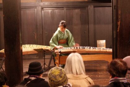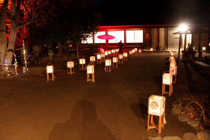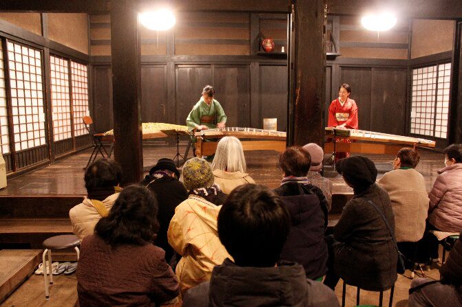 長屋門の庭園内に見事に色づいた紅葉がライトアップされ、幻想的な雰囲気を感じることが出来ます。さらに古民家の中では、二十弦箏、十三弦箏を奏でるお二人により美しく清楚な世界が繰り広げられ、多くの人がこの情景を楽しみました。