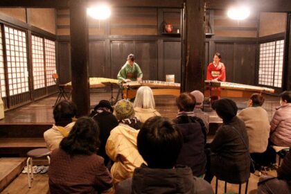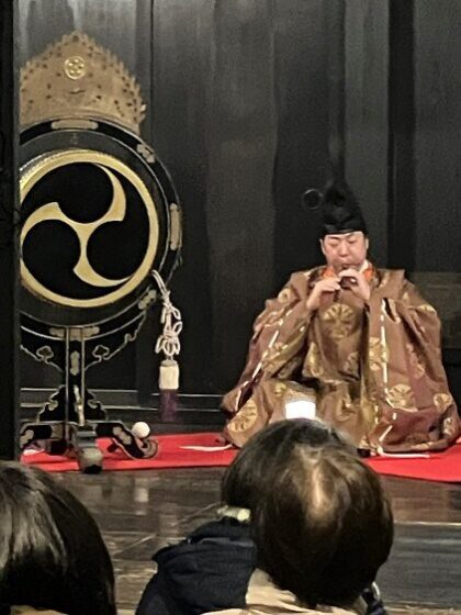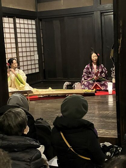 12月7日に続き、第2夜として紅葉ライトアップ中の長屋門古民家の中で雅楽が演奏されました。「みやび」をテーマに雅楽古典曲(歌・管弦・舞楽)が披露され、多くの来場者が麗しく雅やかな平安の世界を満喫しました。