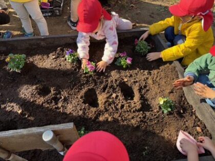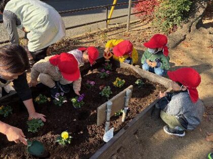 この公園は原中東自治会と相鉄自治会が共同で公園愛護会を運営しており、花壇の整備を行いました。今回は公園のお隣にある、阿久和保育園「たんぽぽ組」さんの15名にもお手伝い頂きました。先生に指示してもらいながら、みんな楽しそうに作業してくれました。