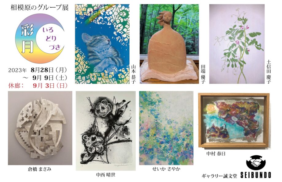 相模原市役所そばのギャラリー誠文堂では8月28日(月)から9月9日(土)まで、グループ展「彩月(いろどりづき)2023」が開催されます。展覧会名の「彩月(いろどりづき)」とは、9月の異名。相模原在住のアーティスト7人の多種多様な作品が並びます。「多彩な作品が織りなすハーモニーを、ゆっくりとお楽しみください」とオーナーの中澤さん。今回参加するアーティストの代表者は「今後も、これからの季節にふさわしい、彩りとバラエティに富んだ展観を相模原から発信し続けたい」とコメントを寄せています。