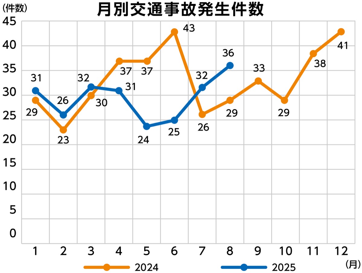 同署の佐藤哲也交通課長は「車両同士の追突、交差点での右折×直進の事故、歩行者横断中の事故などが多く発生している。無理なすり抜けや速度の出し過ぎが事故の原因になる。ゆとりある運転をしていただきたい」と警鐘を鳴らす。