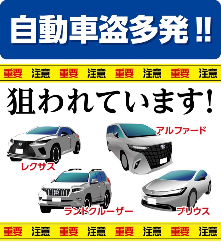主に挙げられる防犯対策は、防犯カメラの設置や人通りの多い場所に車を停めるなどの「見える対策」。警報装置を設置するなどの「音が鳴る」防犯対策をするとともにハンドルロックやタイヤロック、GPS機能付き位置探査装置の取り付けなどを組み合わせ、物理的に盗難が困難になるような整備も効果的だ。ディーラーに防犯機能の追加を相談することも有効な手段だといい、同署は啓発に努める。