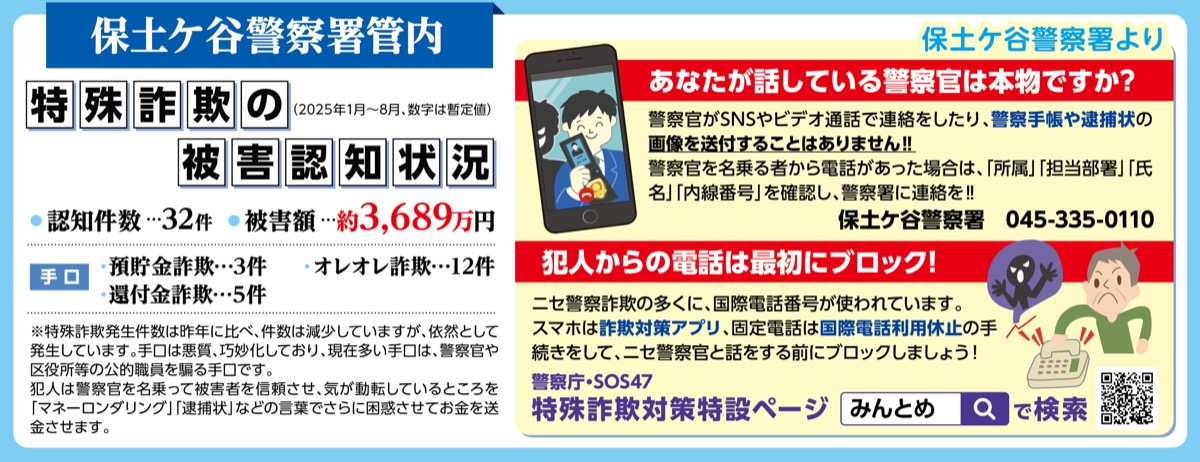 午後3時30分から5時30分まで。開場は3時。入場無料。予約不要。「ほどぴーイラスト付き防犯ホイッスル」が来場者にプレゼントされる。問い合わせは保土ケ谷防犯協会【電話】045・337・5557へ。