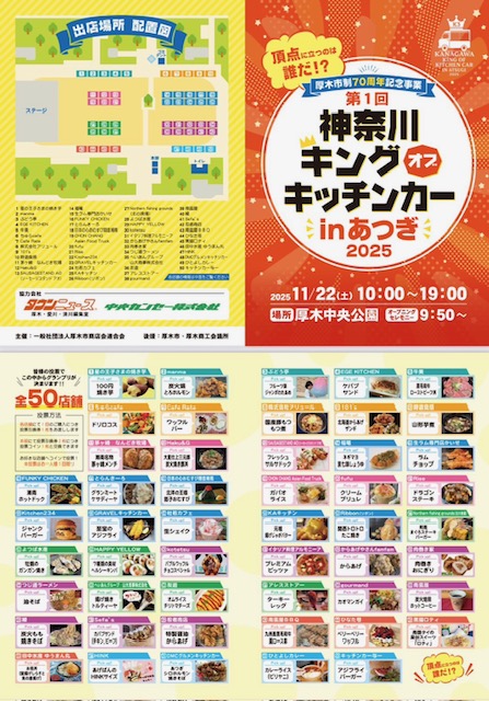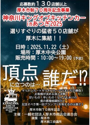 今週!2025年 11月22日(土)に、厚木中央公園でイルミネーションの点灯式と、第一回神奈川キングオブキッチンカーのイベントが行われます!キッチンカーのイベントはなんと!キッチンカー50台による、ガチンコキッチンカーバトルです!