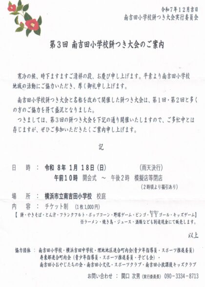 令和8年1月18日(日)午前10:00~ 第3回南吉田小学校もちつき大会が行われました。