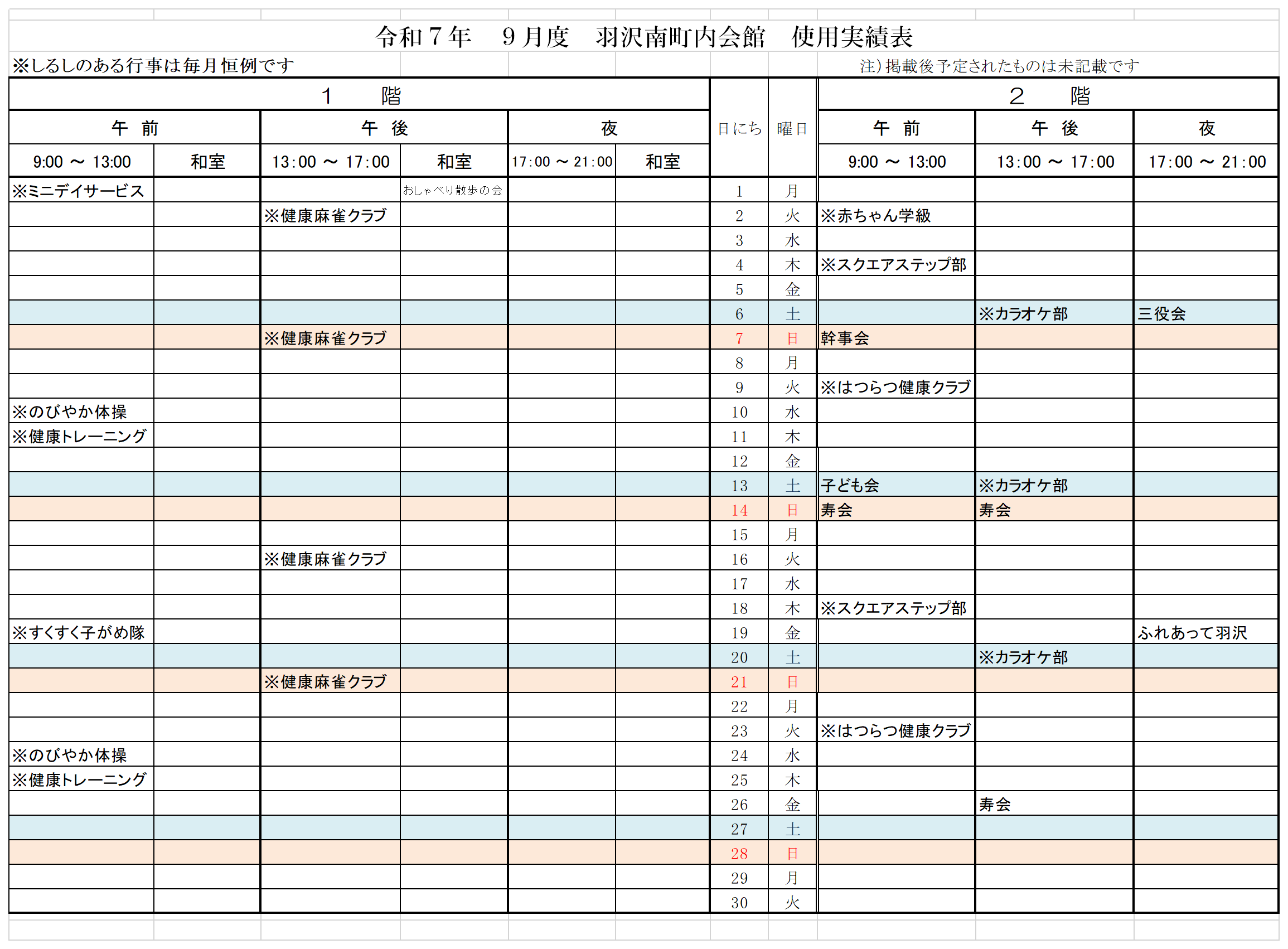 令和7年度 町内会館使用予定表(クリックして拡大表示できます)
