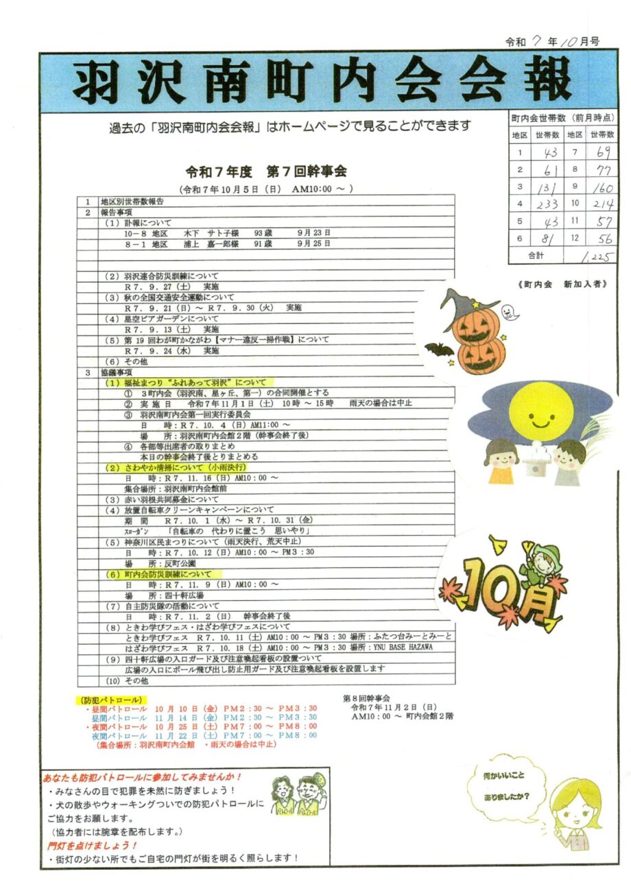 『羽沢南町内会会報』は毎月町内会が発行し、毎月初の幹事会で配布し、回覧板として各地区の皆様に閲覧いただいています。