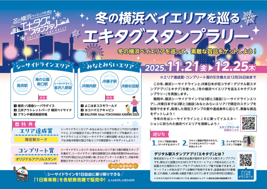 2025年11月発行の冬号では「冬のおすすめ 絶景&最新スポット」と題し、空気が澄んでいる冬こそ見たい沿線絶景スポットや、2025年4月オープンの新スポット「Landport横浜杉田」、おすすめグルメ情報などをご紹介しています。冬の横浜ベイエリアを巡る「エキタグスタンプラリー」も実施します!