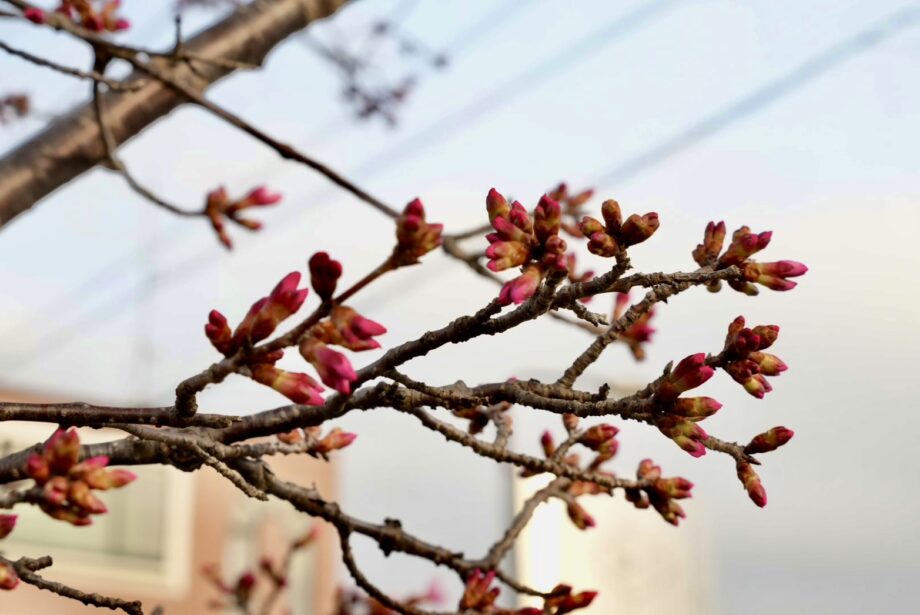 午前7時半ごろの平和橋近くのおかめ桜です。今日から観測スタート。まだ蕾が多いですが、蕾の中にはピンクの花びらが見え隠れ。これから随時投稿していきます!