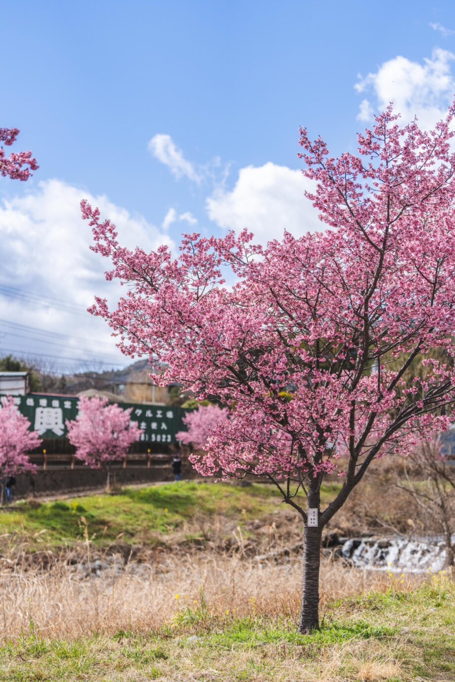 午後1時半頃の平和橋北側おかめ桜。満開になりました。雨上がりで空気が澄んだ今日は、丹沢とのコラボが絶景です!散歩に訪れている人もいました。