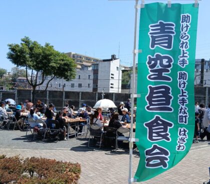 4月11日(土)11時から羽沢長谷公園で、はざわプロジェクト主催のあおぞら昼食会が開催され、用意した手作りのカレー250食分が1時間でなくなってしまいました。当日は、前日の春の嵐のようなお天気から一転、さわやかな、まさにあおぞらのもとで、開始時刻からたくさんの方たちがご来場され、おいしいカレーをいただきました。