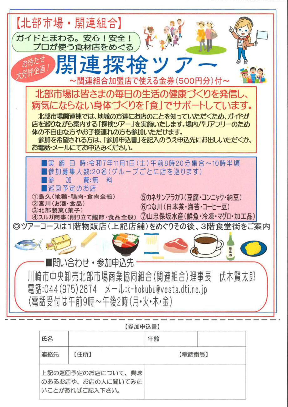 川崎市中央卸売市場北部市場関連棟では、地域の方々にお店のことを知っていただくため、11月1日(土)「関連探検ツアー」を行います。市場でのお買い物デビューにもぴったりで毎回大人気のこの企画。先着20名の事前申込制となっています。
