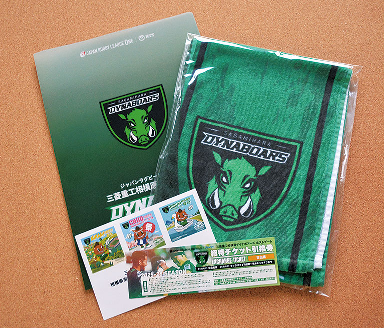 相模原のラグビーチーム「三菱重工相模原ダイナボアーズ」から、豪華4点セットのプレゼント!クリアファイル、タオルマフラー、ステッカー、そして4人分の観戦チケット引換券(ホストゲーム対象)が入っています。相模原ギオンスタジアムへ応援に行こう!