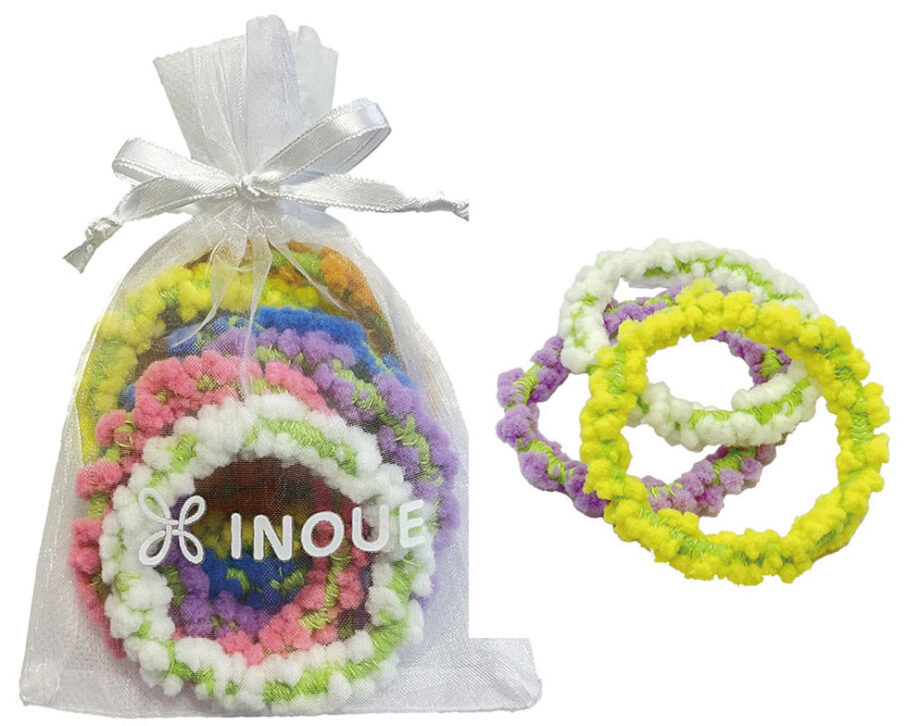 日本にあるヘアゴムの7~8割を生産している緑区鳥屋の「株式会社イノウエ」から相模原の子どもたちへ、フラワークラウンヘアゴム6本(6色×各1本)セットのプレゼント!なんと、ドラッグストアや百円均一ショップで販売されているヘアゴムのほとんどはイノウエで作られたものだそうです。