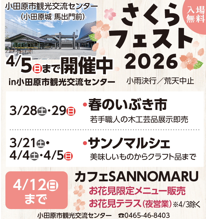 さくらフェスト2026 特等席でお花見を<小田原市観光交流センター> (PR) シェアする 小田原城址公園馬出門の前。若手職人の木工芸品展示即売「春のいぶき市」や、美味しいものからクラフト品まで揃う「サンノマルシェ」などが楽しめます。 併設のカフェSANNOMARUはお花見限定メニューがおすすめです! 小田原さくら特集を見る 住所神奈川県小田原市本町1-7-50 小田原市観光交流センターMAPで表示ホームページ外部HPリンク 公開日:2026-03-21関連タググルメPRパン・スイーツ シェア ポストする LINEで送る 関連記事グルメ 131【3月28・29日】川崎区・富士見公園で「お花見とビール祭」焼き鳥など多彩なキッチンカーが集結!観光・レジャー・遊び 16640【小田原さくら特集2026】お花見前にチェック!桜穴場・まつり・グルメ まとめ情報グルメ 119米粉が主役のパン&スイーツ<komebiyori (コメビヨリ)>グルメ美味しい最中と 焼きたて団子<福来すずめ> 人気記事神社・寺・教会 78097「本村神明社(ほんむらしんめいしゃ) 横浜市旭区鎮座」初詣、七五三や人形供養は地元の神社へNEW桜・お花見 33941【2026 小田原・桜の季節限定】臨時駐車場はここ!桜・お花見 18632<保存版>「はだの桜みち」の上手なめぐり方!臨時駐車場・イベントなどお花見に欠かせない情報満載観光・レジャー・遊び 16640【小田原さくら特集2026】お花見前にチェック!桜穴場・まつり・グルメ まとめ情報 注目記事NEW取材レポート【保存版】秦野でお花見「無料駐車場」はどこ?混雑回避の穴場ほか必勝法ガイドNEW住まい・暮らし・生活〈まち歩き発見レポvol.1〉外を向いたら目の前の物件が輝いて見えた話~山北町・サンライズやまきた~NEW住まい・暮らし・生活 2116厚木市の「愛名やまゆり園」が目指す利用者支援は「利用者の想いや夢の実現に向けて一人ひとりの人生に伴走します」▶お知らせは随時更新グルメ 119米粉が主役のパン&スイーツ<komebiyori (コメビヨリ)>