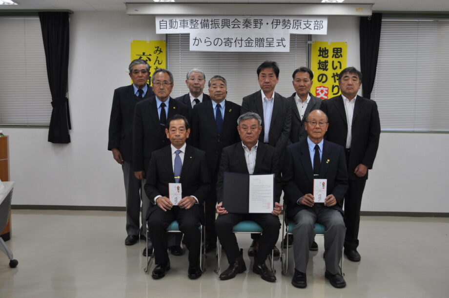 神奈川県自動車整備秦野・伊勢原支部より、地元の交通安全事業への支援として、今年も秦野市交通安全協会と伊勢原交通安全協会へ寄付をいただきました。