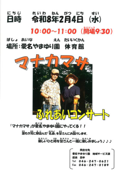 ◎厚木市の施設「愛名やまゆり園」にて、音楽ユニット「マナカマサ」を招いた「ふれあいコンサート」が開催されます 。