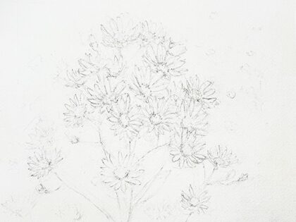 ① 紫苑はたくさんの花の集まりです。主役にする花を中心に下書きします