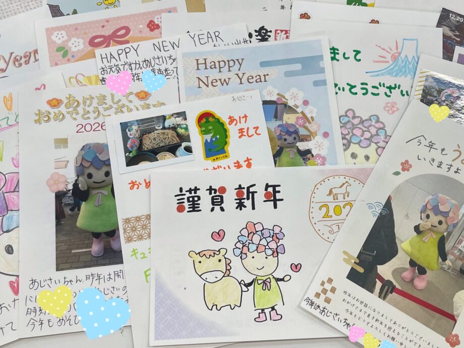 ところで開成町のあじさいちゃんは、毎年、北は北海道、南は沖縄まで、全国各地からたくさんの年賀状を頂戴しています!「どこであじさいちゃんを知っていただいたのかな?」と不思議に思うと同時に、こんなに有難いことはないなと感じています。