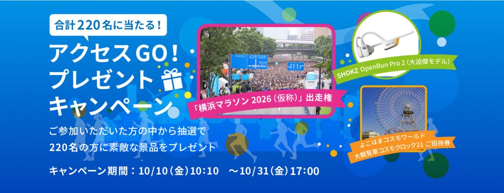 - 「横浜マラソン2026(仮称)」の出走権(6名)やSHOKZ「OpenRun Pro2(大迫傑モデル)」の骨伝導イヤホン(5名)、横浜ベイホテル東急「カフェトスカ・ブッフェペア券」(ランチ1組2名、ディナー1組2名)、よこはまコスモワールド「大観覧車コスモクロック21」ご招待券(15組30名)など、豪華景品を多数用意!