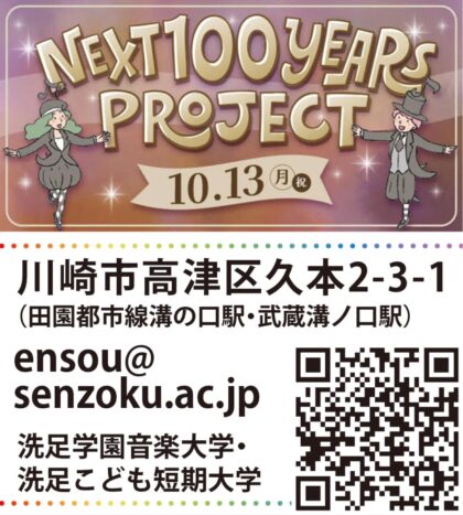 また、学園祭の翌日10月13日(祝)には、創立101年目の洗足学園が子どもたちに贈る特別コンサート「Next 100 Years Project」が学校敷地内の前田ホールで開かれる。
