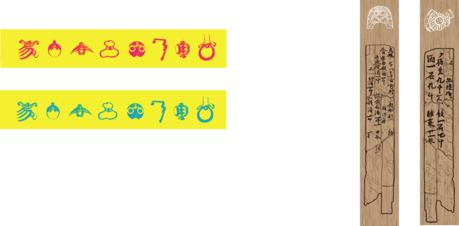 マスキングテープは柳島村名主・藤間柳庵が考案した「家内安全火乃用心」をデザインしたもの(左)と本村居村遺跡から出土した木簡をデザインしたもの(右)の2種類