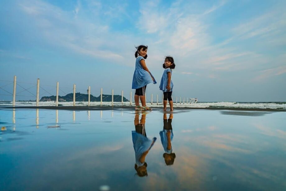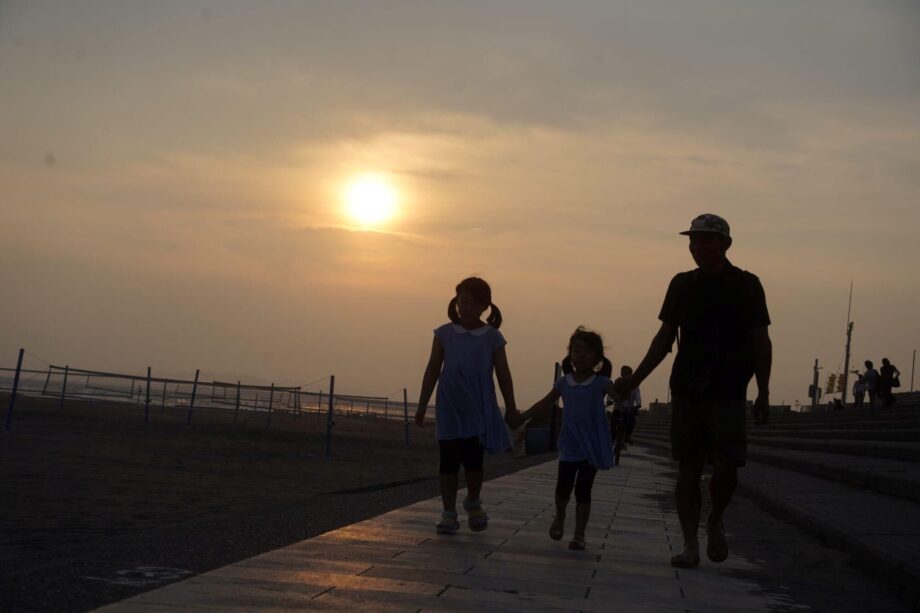 次に狙うのは、空が燃えるように赤く染まる、通称「爆焼け」です。撮影ポイントを変えるために砂浜を歩いていきます。Hanaちゃんとyuduちゃんは、楽しそうに追いかけっこをしていました。
