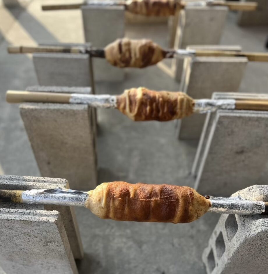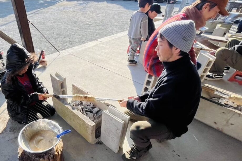 お昼は、地場野菜や山北町の美味しい水で育てたお米を使った鹿肉「ジビエカレー」を予定。バームクーヘンは竹に生地を垂らしながら、炭火で焼いて手作り体験ができます。できたてのケーキはもちろんおやつに食べられます。