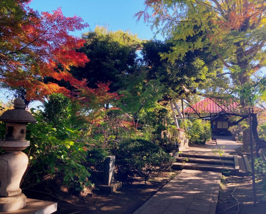 最初に訪れたのは、駅からほど近い「徳善寺」。駐輪スペースに自転車を停め、一歩境内に入ると、そこは別世界のような静けさです。境内を彩る木々の赤、黄、緑のコントラストが素晴らしく、歴史の深みを感じさせてくれます。