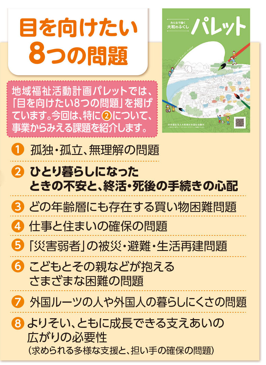 地域全体で支え合う「身元保証」や「終活・死後の手続き」について、大和市社会福祉協議会として今行っている権利擁護事業との関連でどのように取り組みができるのか、仕組みの研究や検討を進めていきます。