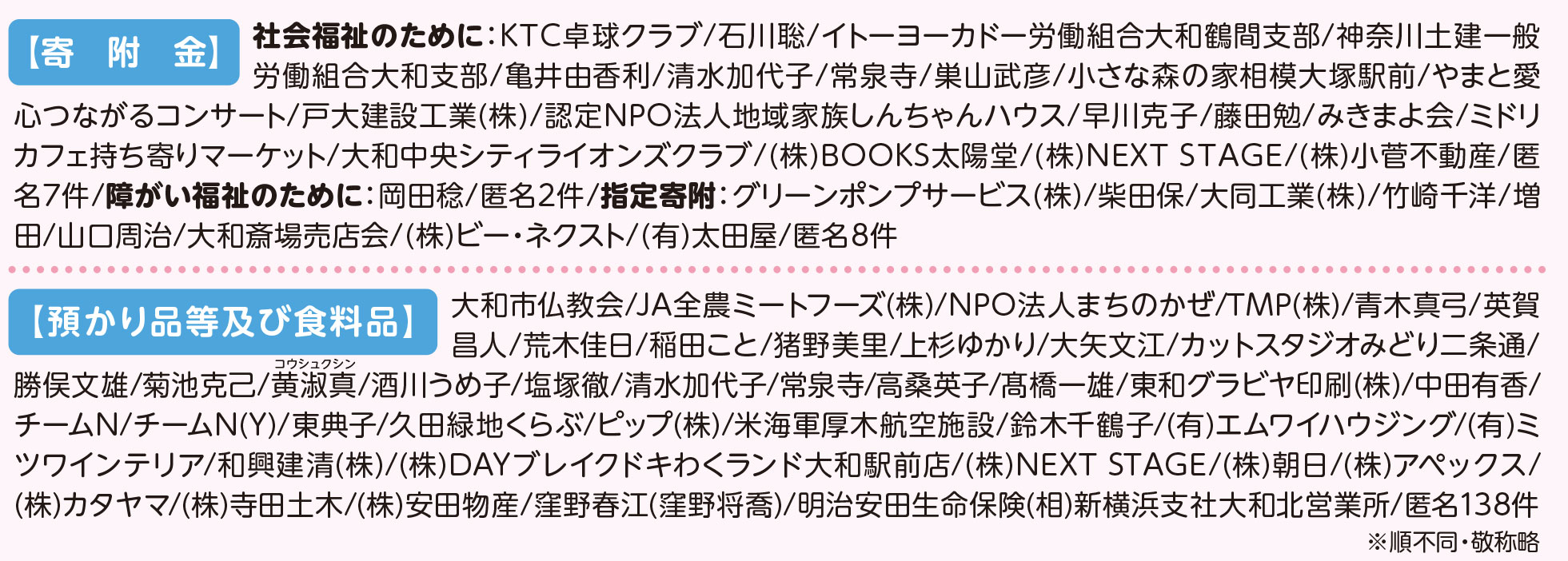 ●大和市社会福祉協議会表彰:亀井由香利/田邉潤/西山奈津子/JCOM (株)技術サポート本部 湘南・神奈川技術センター/(有)エムワイハウジング/佐藤高一/鈴木良夫/鈴木勝雄/岡本忠/前畑勲/内田ユキ子/石川常夫/大安智子(故人)/保田弟治/遠田昌彦/市川春男/石井敏英/鈴木恵美子(故人)