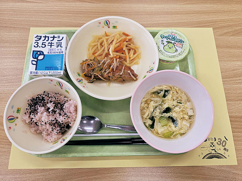 30周年を祝う特別な献立の給食が15日の式典後に振舞われ、児童たちが堪能した。