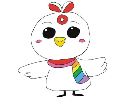 昨年度に全校児童からデザインを募り、投票によって決まった。デザインしたのは、昨年度卒業した山田咲希さん。母親と一緒に考え、校名の「鶴」をモチーフにデザインした。つるりんの額の赤い輪は、学校と地域のつながりをイメージ。首元の虹色のマフラーがアクセントとなっている。